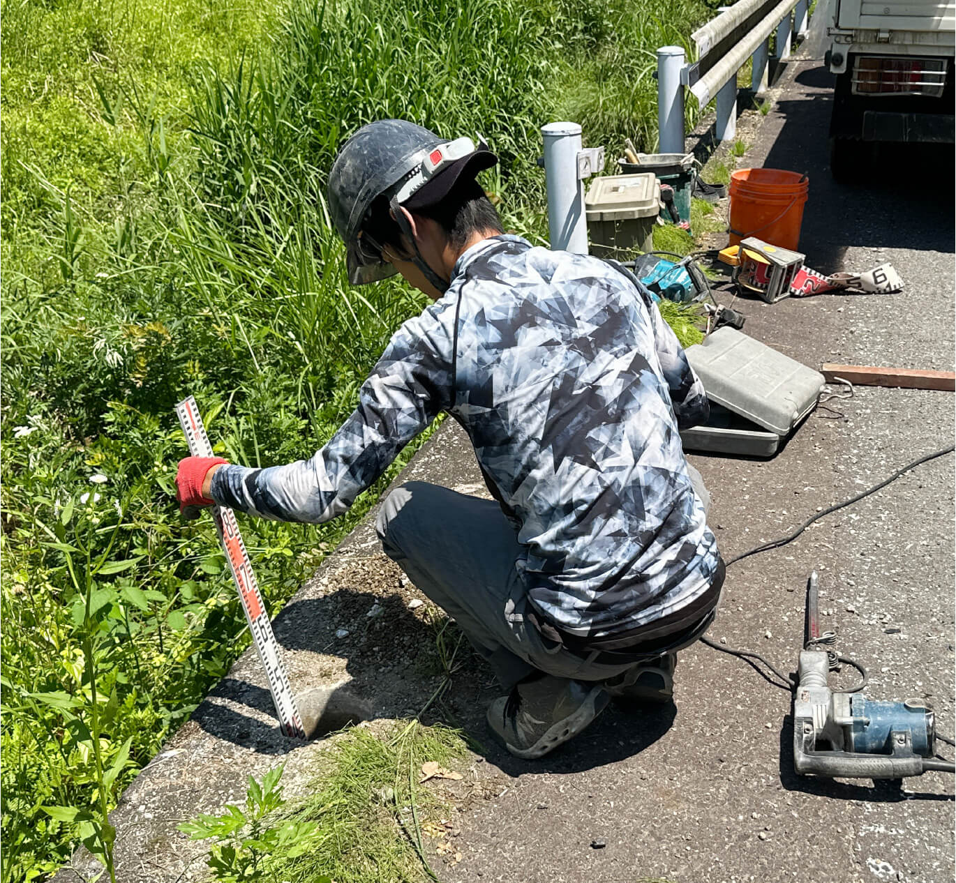 この仕事はお客様からの要望を受けて行う一般的な土木工事や改修工事と違い、事故で壊れた部分を直しに行く仕事。特に民家の塀などの修繕では被害に遭われた住人の方へ配慮しながら作業を進めていくことが重要になります。難しい面もありますが、綺麗に元通りになると「ありがとう」と声を掛けてもらえることもありますよ!